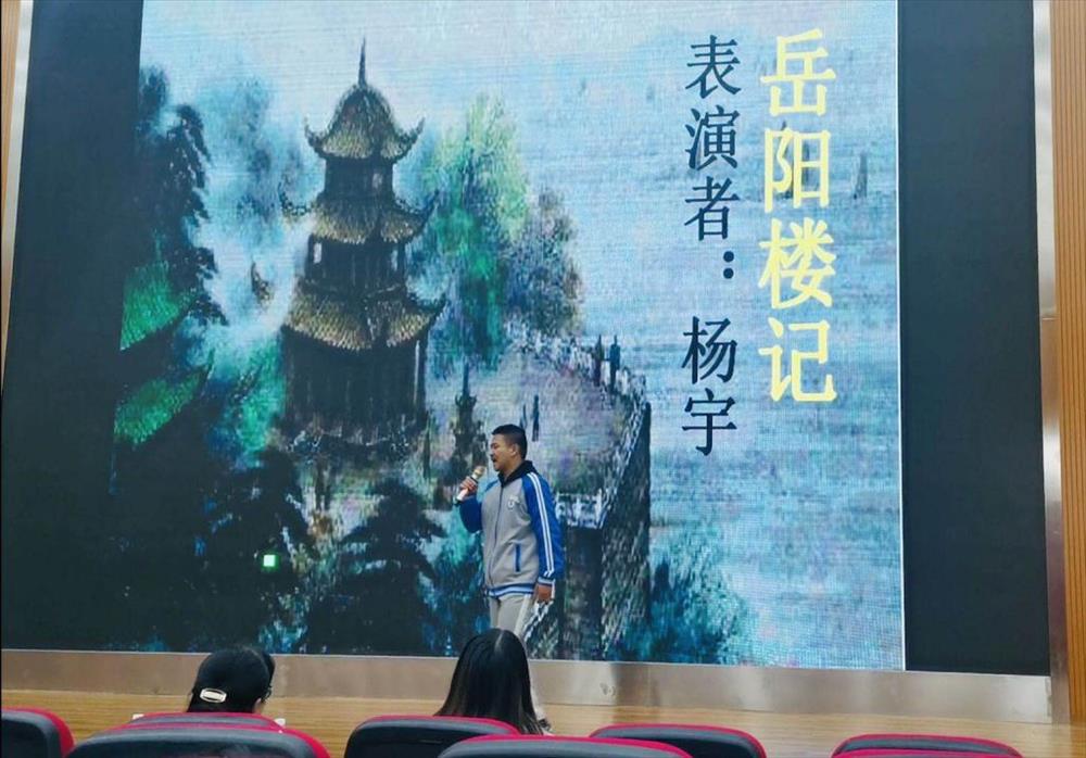 本次朗诵比赛由王文芳老师、赵丽霞老师、贺萍老师、彭曦蓝老师担任评委,从朗诵内容、语言表达、作品演绎、仪表仪态等六个方面进行综合评分。经过激烈地角逐,荣获本次朗诵比赛一等奖的作品是高二(1)班杨宇《岳阳楼记》、高二(4)班集体朗诵《水调歌头》 ;荣获二等奖的作品是高二(1)班集体朗诵《祖国啊,我为你自豪》、高一(2)班集体朗诵《给青春上点颜色》;荣获三等奖的作品是高一(2)班集体朗诵《江山必以梦为先》、高二(3)班集体朗诵《中华颂》。