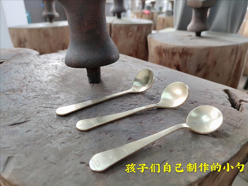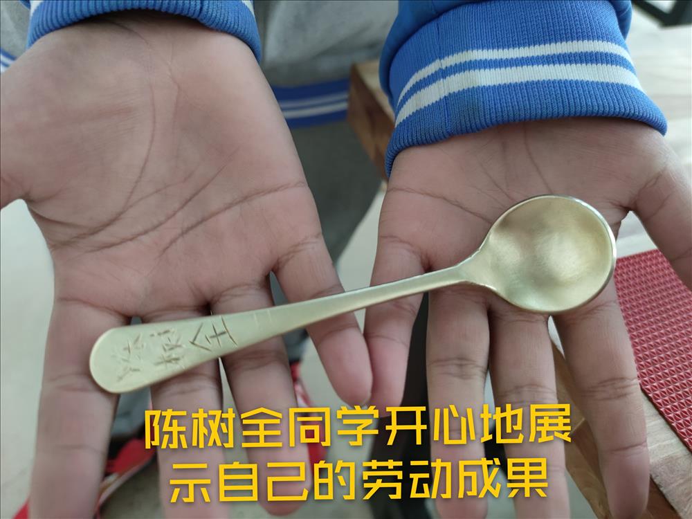 孙靖淇同学开心地说:“通过乌铜走银工艺的学习,我制作了精美的戒指和铜勺,我觉得很有成就感,未来我会把这种精益求精、追求卓越的工匠精神带到学习生活中去。”