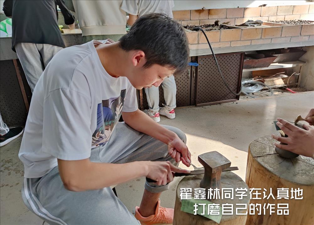 在叮叮当当声中,一把把铜勺诞生了,同学们互帮互助,抛光打磨、手工打磨,将初成型的器物进行清理抛光处理,以其繁杂的纯手工工序,造就细腻入微的纯美艺术品。