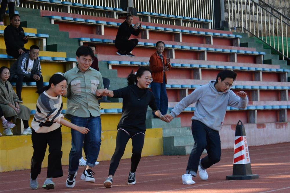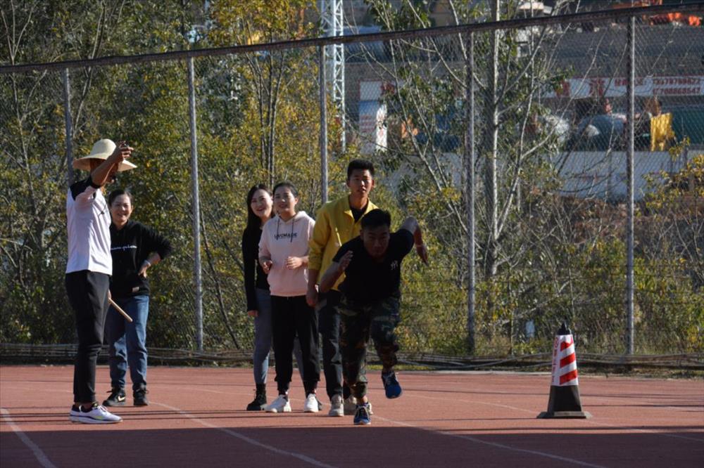 首先进行的是“滚雪球”比赛。随着裁判开赛的哨音,各学部代表队老师手拉手绕过起点、终点标志物,双方队伍展开了激烈的角逐,最终全部队员全部超过起点并折返至中点击鼓计时,根据用时长短决出名次。经过三轮比赛,现代服务学部代表队以1分12秒77的优异成绩获得第一名。