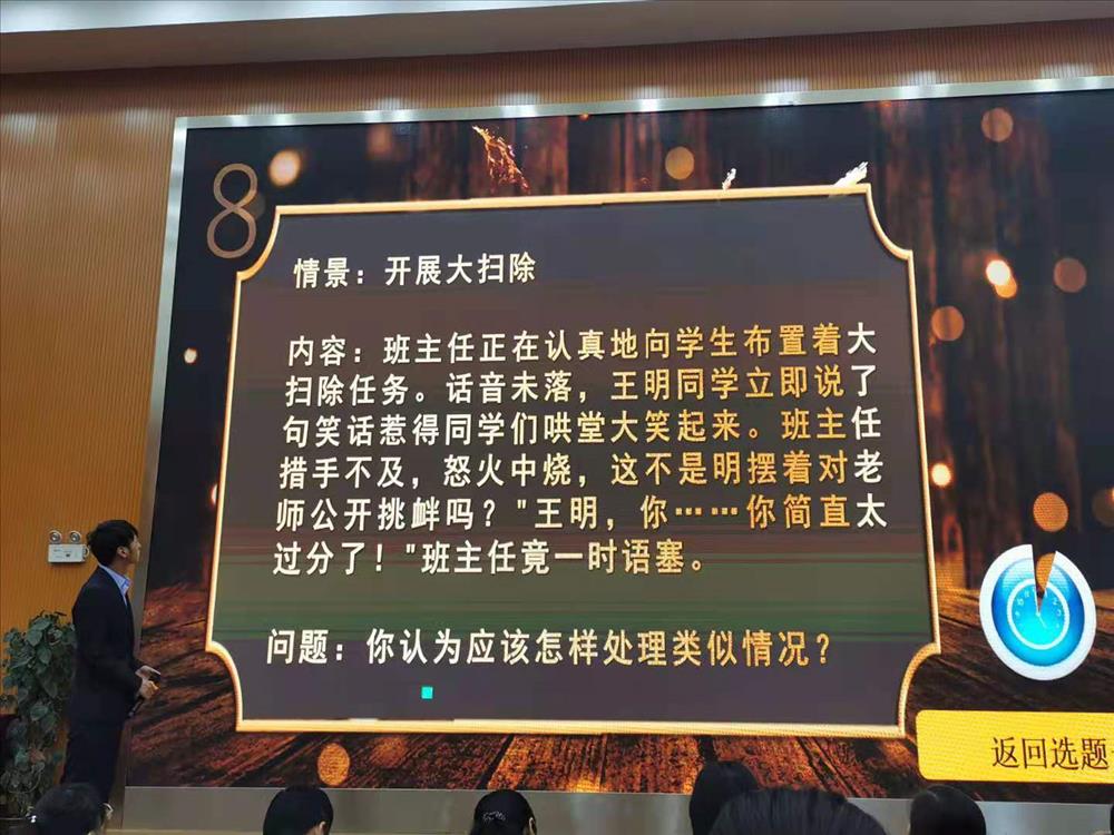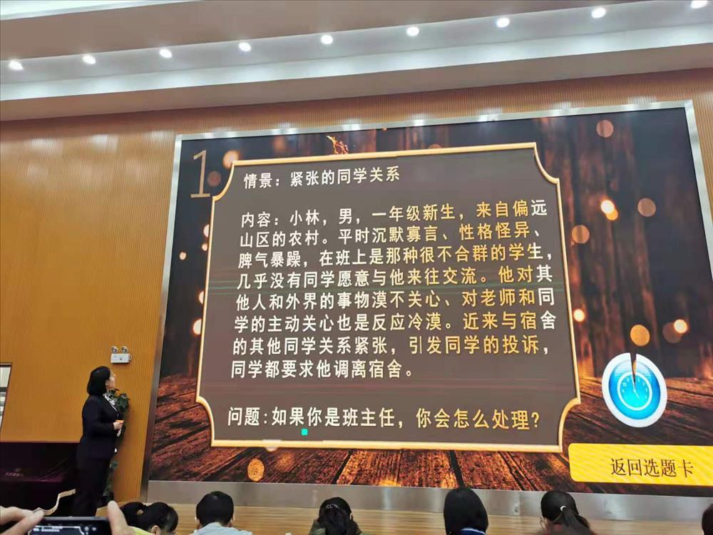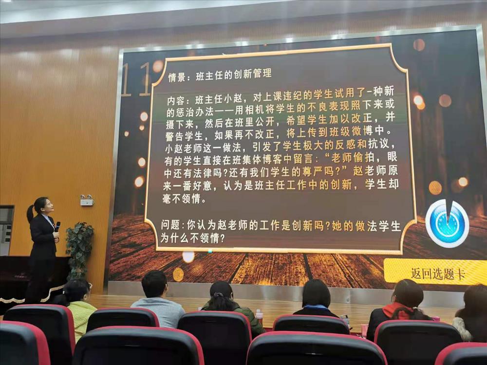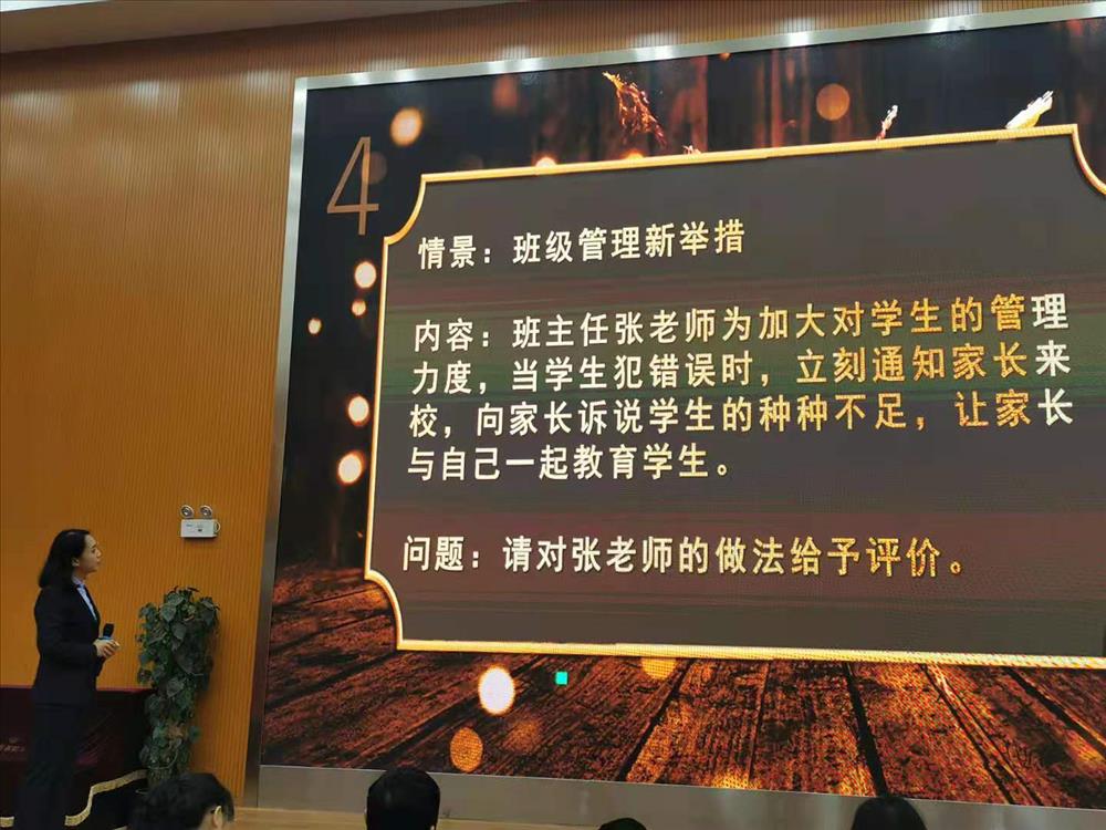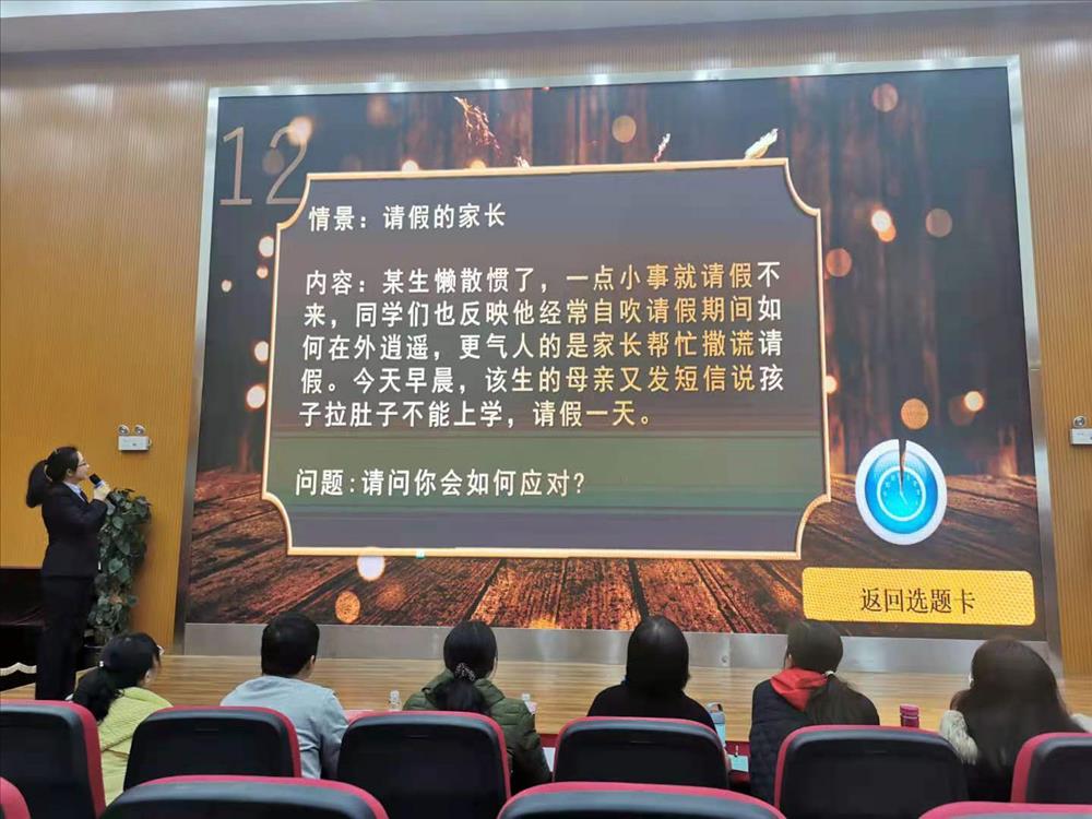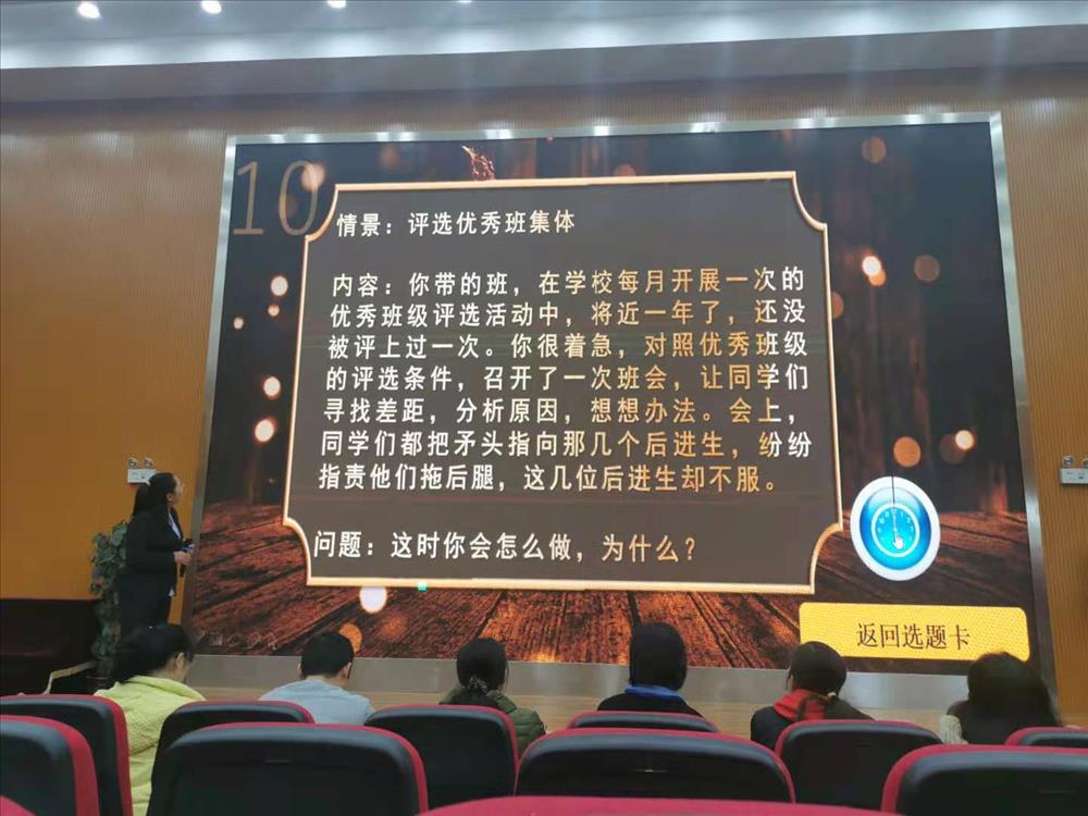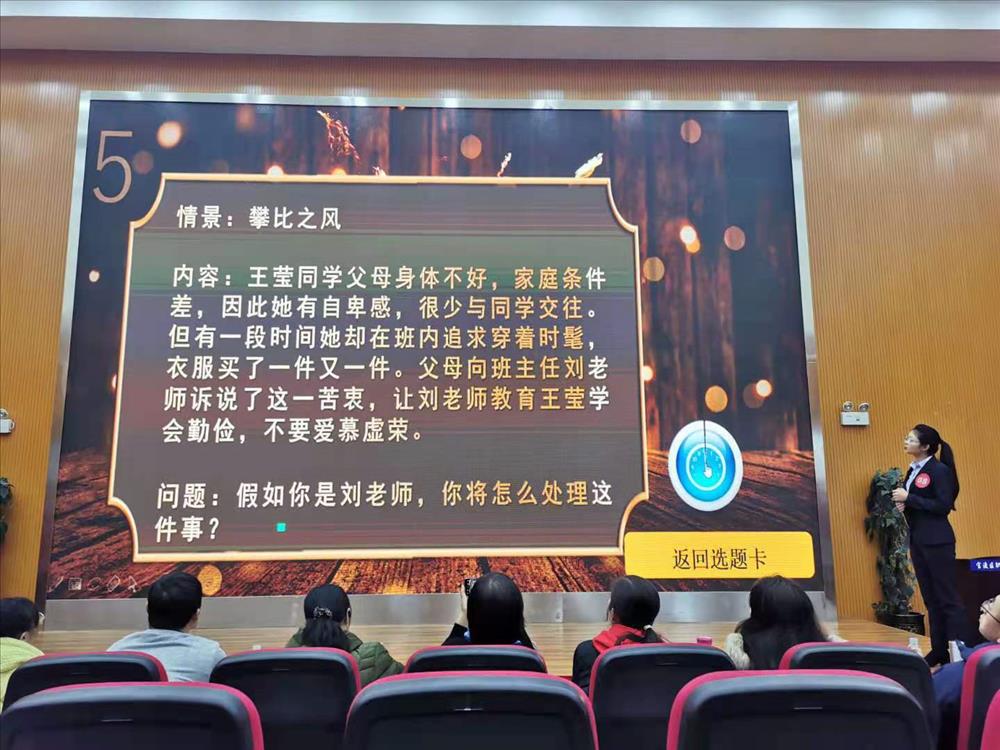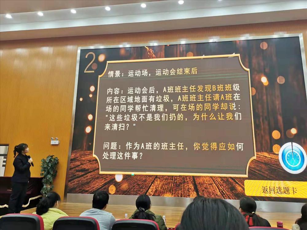 比赛过程中参赛教师们,充分运用多媒体,结合自己亲身带班经历,侃侃而谈,讲述自己的带班心得,充分体现出各位教师“以爱育人、以心换心”的教育理念,和“信任、自主、奉献”的带班理念。