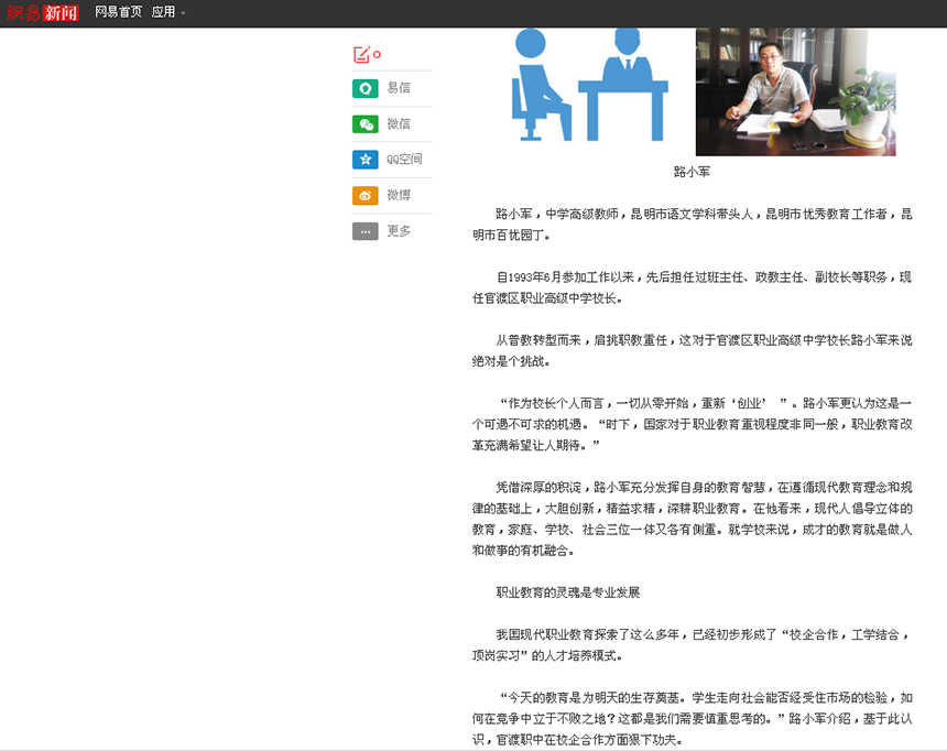 中学语文高级教师,研究生学历。第六届黄炎培职业教育“杰出校长”,云南省首届 “万人计划”教学名师,昆明市首届“春城教学名师”,昆明市第四届“路小军名校长基地”主持人.