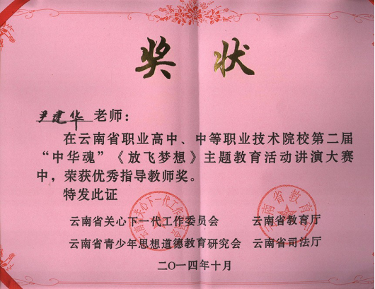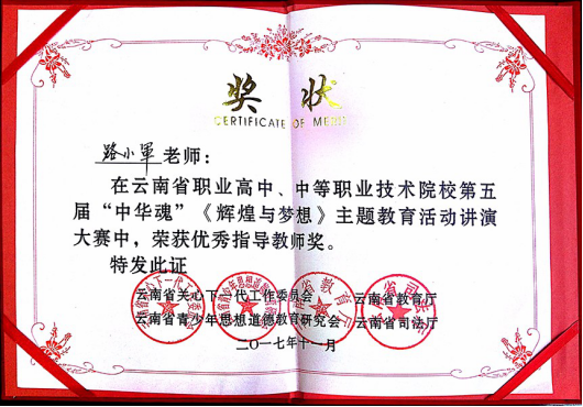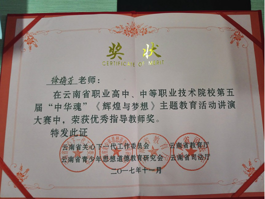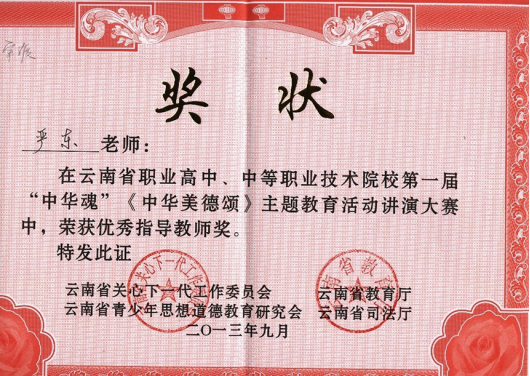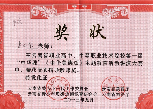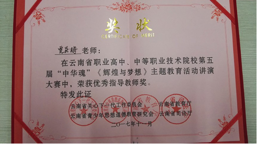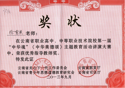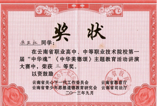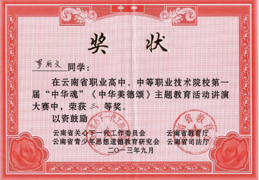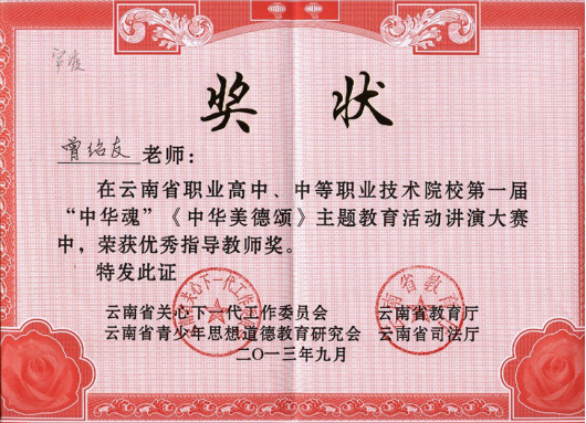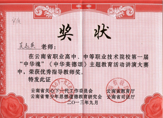 2009年第六届云南省教育工作者优秀论文征稿活动中《职业教育高中学生抑郁问题心理辅导案例报告》获二等奖;