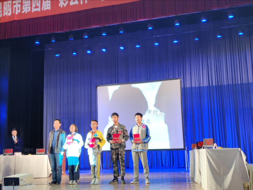 为了丰富学生校园文化生活,弘扬时代新风,传承经典文化,激发广大同学对中华传统文化的热爱,11月20日,由昆明市教育体育局主办的昆明市第四届“彩云杯”优秀传统文化知识竞赛在昆明市青少年活动中心隆重召开,我校五名师生和东华二小、十二中的十五名师生组成了官渡区代表队,由官渡区教育体育局周江科长亲自带队参加比赛。
