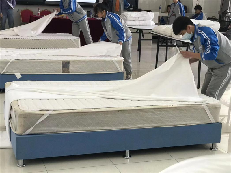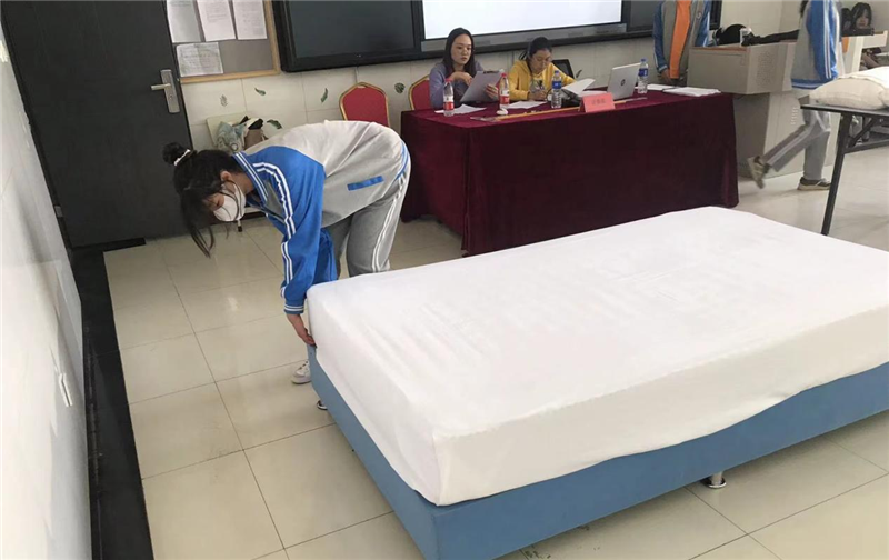 酒店管理专业的同学们就客房铺床这一项目进行比赛。只见每一名参赛选手都手法娴熟,有条不紊地铺开床单、套好被套、折好床脚,整个过程行云流水,令人惊叹。要知道铺床叠被看似简单,确有许许多多的细节不可忽视。尤其是对一名酒店专业的同学来说,细节里蕴藏着专业,专业则是由许多容易让人忽视的细节构成。小小的比赛,即是对平日里学习成果的检验,也是为下一次大赛做准备。