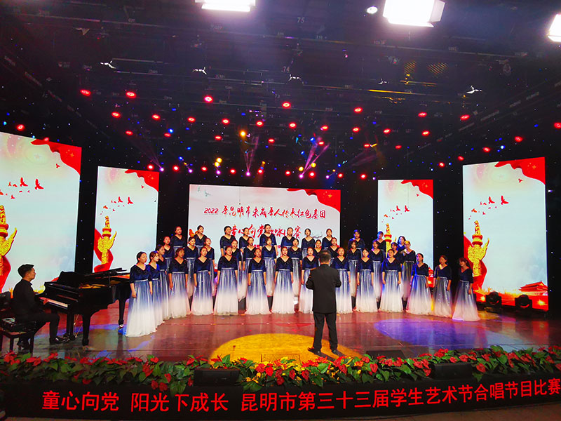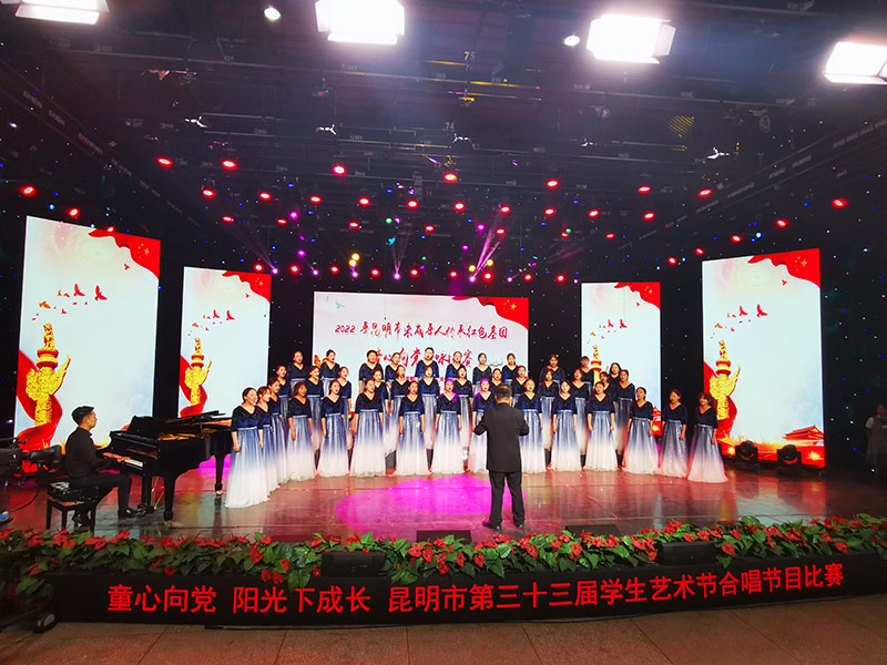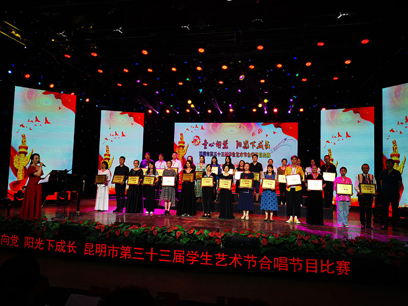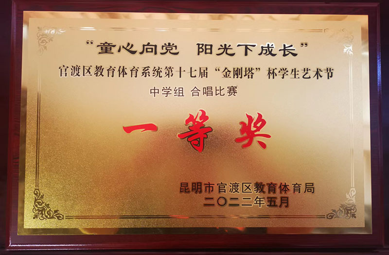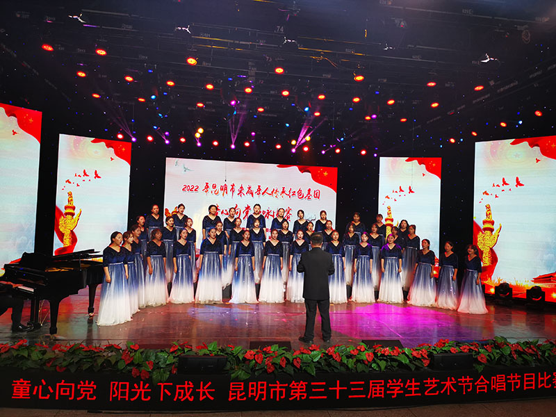 一个月的紧张排练,见证一群孩子们的成长,指导老师一字一句的教唱,每一个字,每一个音都不得有半点随意,最后,孩子们在台上自信的演绎作品,歌声震撼了全场的观众,最终以9.818分荣获 区级一等奖,并于5月28日代表官渡区参加昆明市第三十三届学生艺术节合唱比赛现场决赛,经过同学们和老师们不懈的努力,他们同样以9.796的高分,荣获了昆明市级一等奖。
