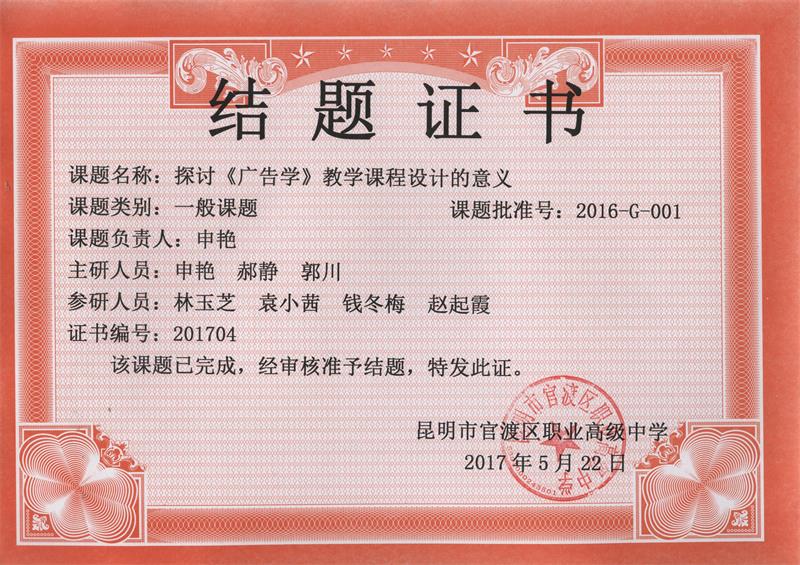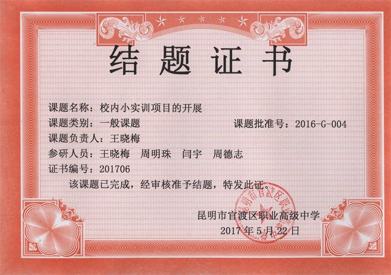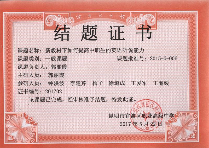 2009年第六届云南省教育工作者优秀论文征稿活动中《职业教育高中学生抑郁问题心理辅导案例报告》获二等奖;
