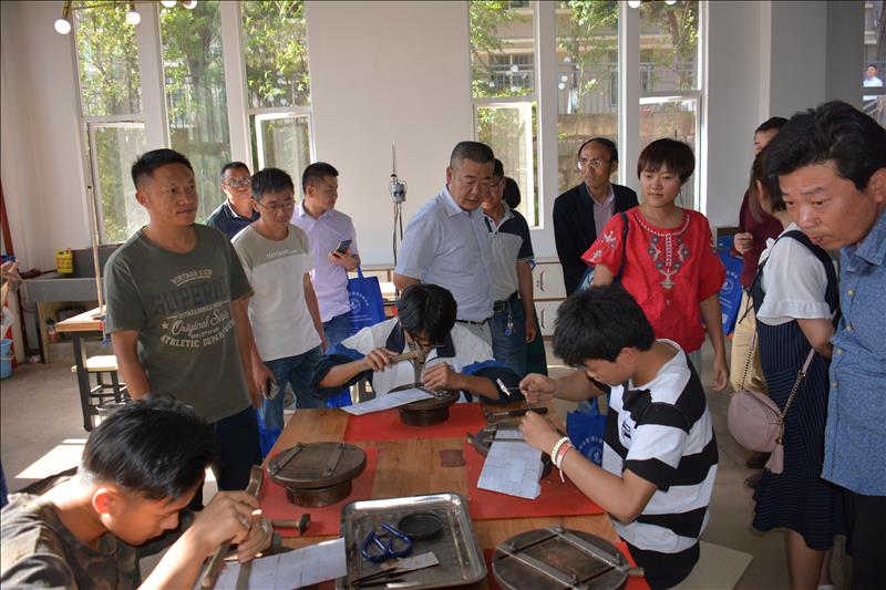 会后,参会的中学校长、初三年级组长在路小军校长的带领下参观了我校校园环境、机器人专业实训设施设备,观摩了我校乌铜走银金大师手工工作室学生的专业技能展示,进一步体会了中职教育的魅力。
